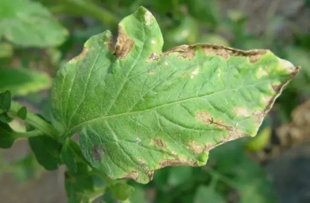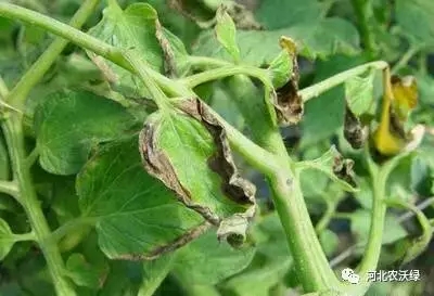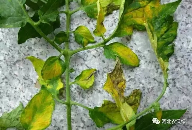 棚室內(nèi)施用大量生餅肥、有機(jī)糞肥后,由于溫度較高,在腐解過(guò)程中會(huì)產(chǎn)生大量硫化氫,硫化氫在空氣中進(jìn)一步氧化生成二氧化硫。二氧化硫氣體由氣孔進(jìn)入葉片,再溶解浸潤(rùn)到細(xì)胞壁的水分中,使葉肉組織失去膨壓而萎蔫,產(chǎn)生水漬斑,最后變成白色,在葉片上出現(xiàn)界限分明的點(diǎn)狀或塊狀壞死斑,嚴(yán)重時(shí)斑點(diǎn)可連接成片,造成全部葉片枯黃。