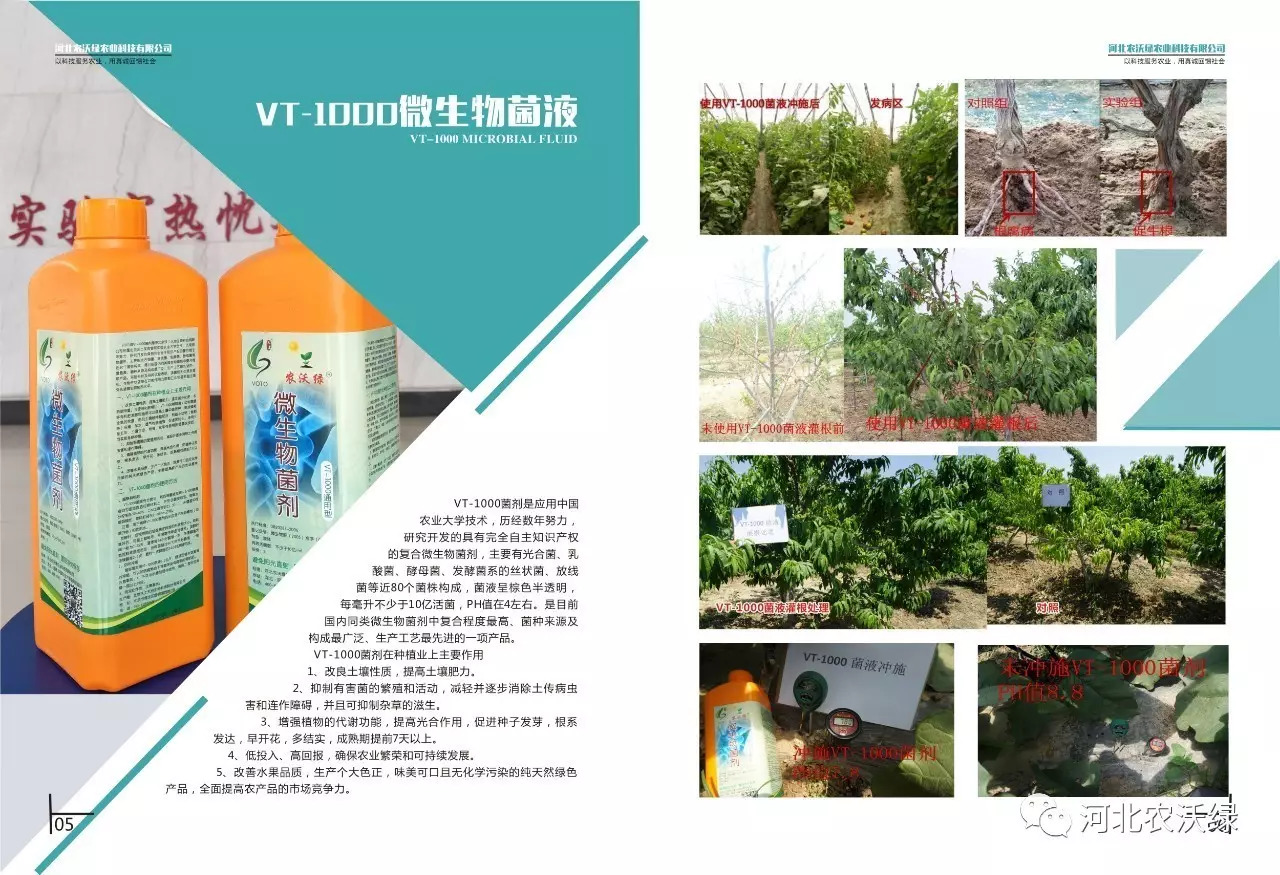 農(nóng)沃綠 VT-1000菌劑是應用中國農(nóng)業(yè)大學技術,歷經(jīng)數(shù)年努力,研究開發(fā)的具有完全自主知識產(chǎn)權(quán)的復合微生物菌劑,主要有光合菌、乳酸菌、酵母菌、發(fā)酵菌系的絲狀菌、放線菌等近80個菌株構(gòu)成,是目前國內(nèi)同類微生物菌劑中復合程度最高、菌種來源及構(gòu)成最廣泛、生產(chǎn)工藝最先進的一項產(chǎn)品。實驗分析及田間實驗表明,該菌劑無論是在理化、生物性狀方面還是在功能作用方面都已經(jīng)達到甚至超過國外先進微生物制劑水平。菌液呈棕色半透明,每毫升不少于10億活菌,PH值在4左右。
