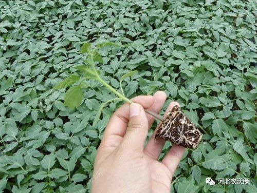 番茄苗定植后,為了加快緩苗,建議緩苗水開(kāi)始使用生根養(yǎng)根類肥料。將“農(nóng)沃綠微生物菌劑”隨水沖施,可以使根系發(fā)達(dá),預(yù)防治療各種根部病害。
