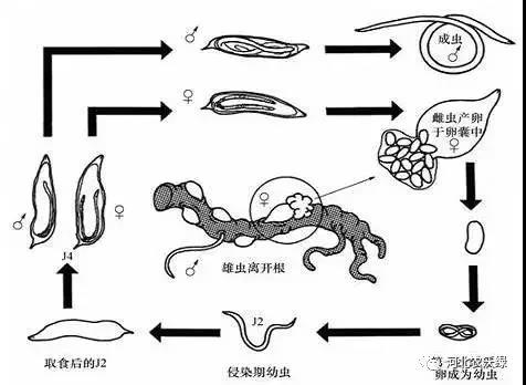 根結線蟲主要以卵和2齡幼蟲隨根瘤在土壤中,或直接在土壤中越冬,在土壤無寄主植物的情況下可存活3年之久。