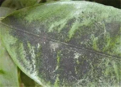 煤污病主要危害植物的葉片,也危害嫩枝、花器等部位。發(fā)病初期在葉面、枝梢表面上形成圓形黑色小霉斑,有的沿主脈擴展,后擴大連片,使整個葉面、嫩梢上布滿黑霉層,形成較厚的黑色或黑褐色的煤煙狀層,嚴重時形成黑色霉層,有時在干燥條件下霉層開裂剝落。