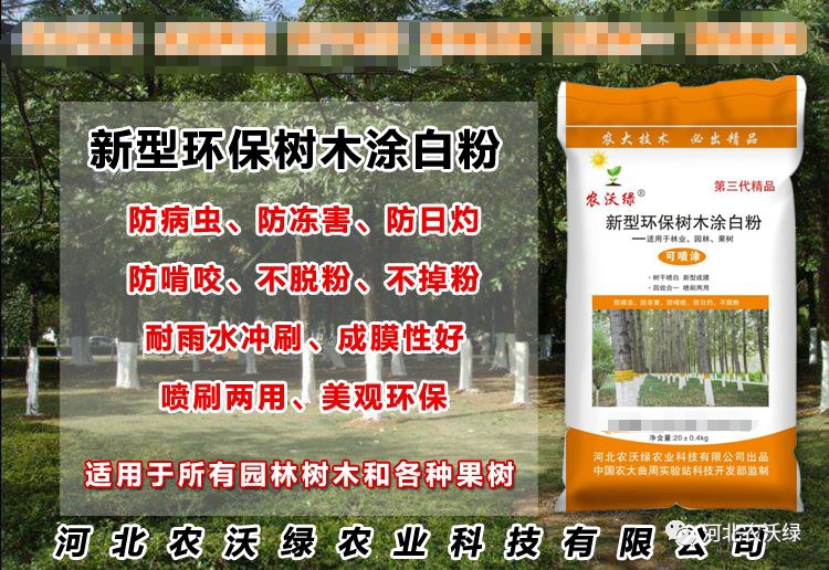 樹體涂白:涂抹農(nóng)沃綠大樹涂白粉,產(chǎn)品四效合一,防止廣泛,不僅防凍效果好,而且還能防啃咬,防病蟲,防日灼等作用。對樹體及土壤有保護(hù)作用。