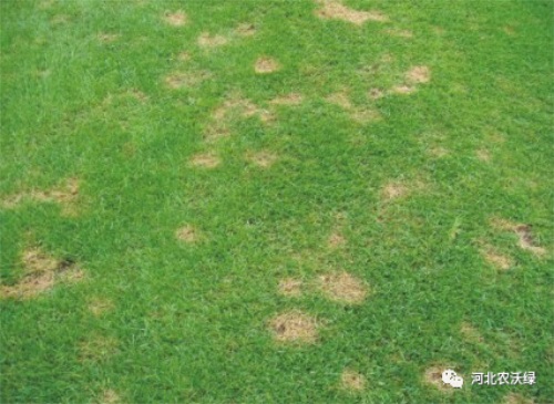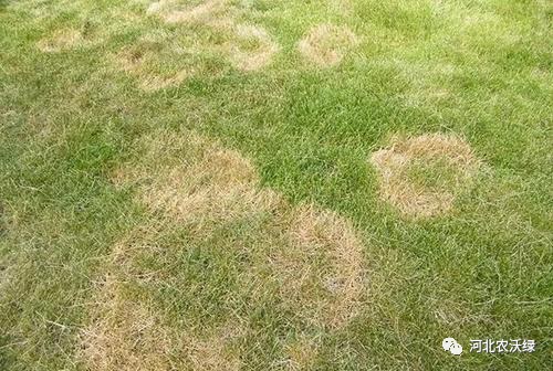 1. 蛙眼狀枯草圈,內綠外黃:這是由于褐斑病對根系危害較輕,最早的發(fā)病中心,地上部死亡,但根系未死,根系又重新萌發(fā)新的幼苗,并逐漸恢復,而發(fā)病中心的外圍卻依然在擴大,便呈現(xiàn)出內綠外黃的枯草圈。在修剪較高的多年生黑麥草、草地早熟禾、高羊茅草坪上,通常沒有煙圈。