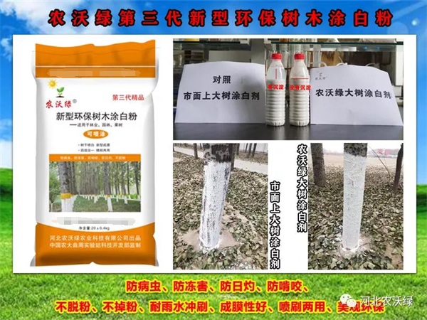 刮掉老皮后應(yīng)及時涂白,可以消滅在樹干上越冬的病蟲,防治凍害。推薦使用農(nóng)沃綠第三代精品樹木涂白粉,它是農(nóng)沃綠公司和農(nóng)大專家采用納米技術(shù)共同研發(fā)的又一環(huán)保新產(chǎn)品,成膜性好,粘著牢固不脫落,防病蟲、防凍害、防啃咬、防日灼,四效合一,保護(hù)全面。噴刷兩用,持久美觀。